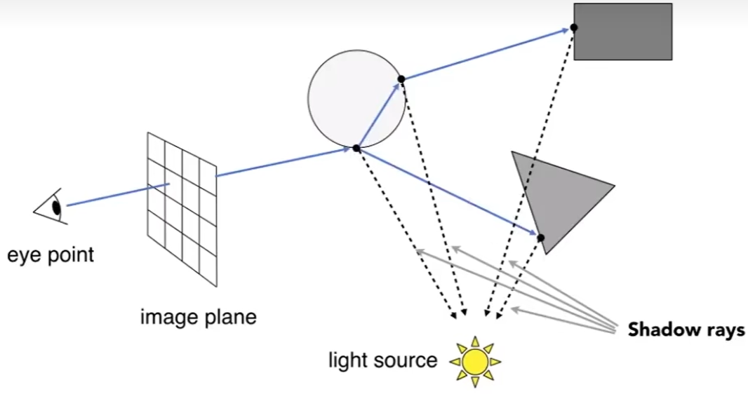 Shadow ray : 交点与点光源连线的射线, 判断光源可见性