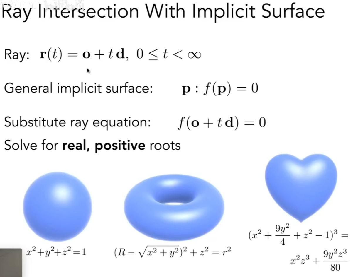 假设光线与隐式曲面会有交点p的情况下, 所以p=o+td, 将光线方程代入隐式曲面方程得出新方程, 进而算出t.