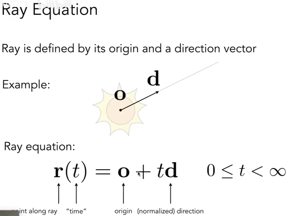 o :光线的起点 d :光线方向(单位向量) 由于光是射线, 所以t是时间 (0<= t <=无穷大)
