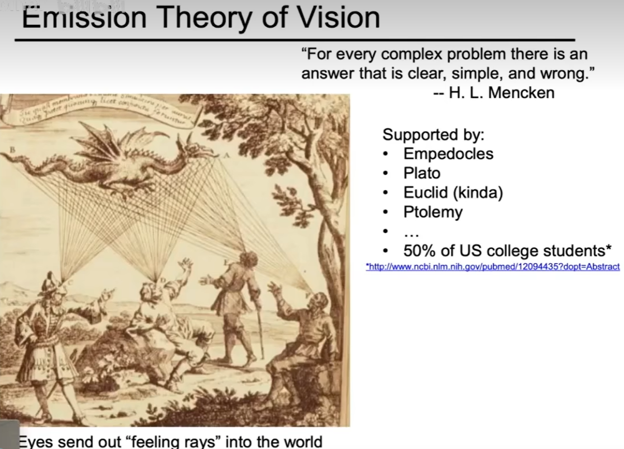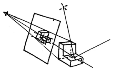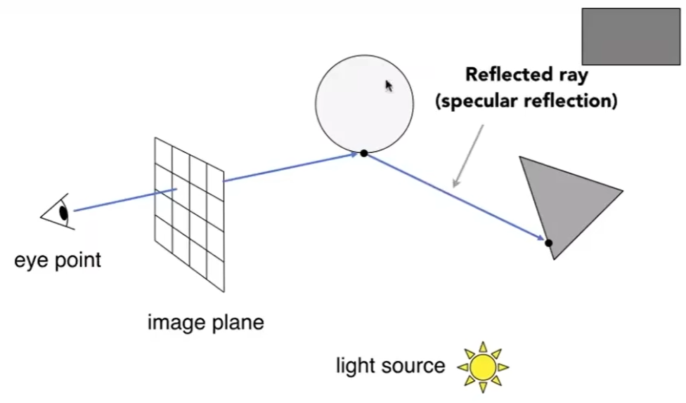 ③ 光线从光源传播到眼睛(但在光路可逆性作用下,物理学是不变的),因此可以假设眼睛发出感知光的线,经过各种反射最终到达光源.