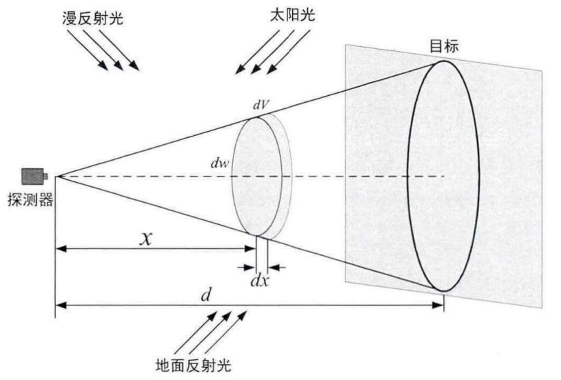 探测器接受到的大气光成分主要包括太阳直射光、大气漫反射光和地面反射光。如下图所示,体积微元