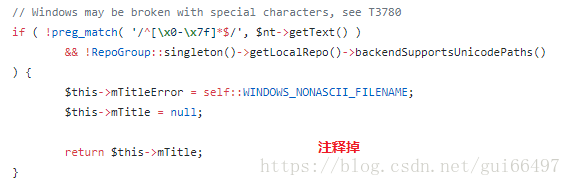 1.找到MediaWiki/includes/upload/UploadBase.php文件,搜索WINDOWS_NONASCII_FILENAME,将这一段if else代码整个注释