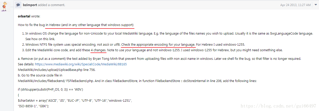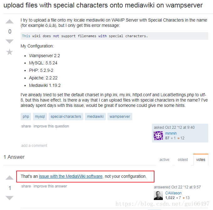 公司内部的wiki是用的mediawiki,其它都还好就是上传文件时文件名中有中文就不能上传,这次下决心要修复这个问题,一开始我还以为是哪里需要配置一下,然后搜了半天发现这是一个官方的bug: