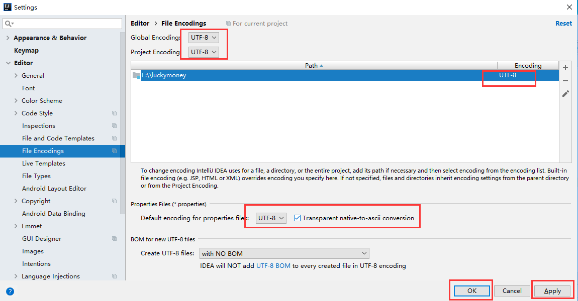 找到IDEA的Settings中的File Encodings,将图中标红的配置都统一设置为UTF-8,最后点击Apply应用和ok。