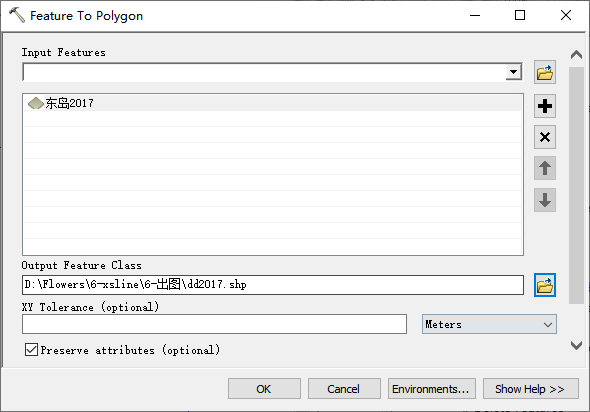 在data management tools中找到features-feature to polygon,将要素转化为面