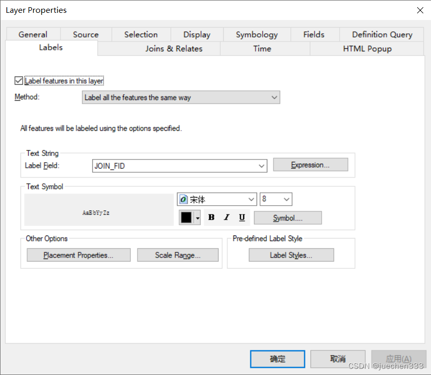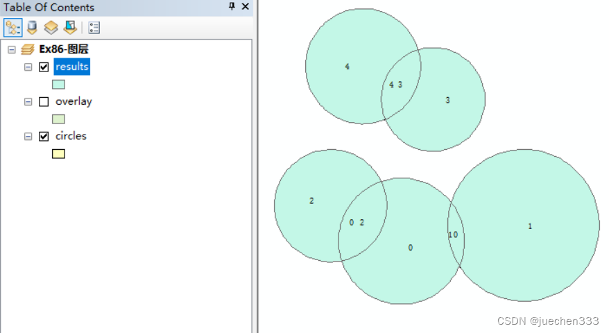 右击“results”图层,点击【Properties】打开【Layer Properties】→【Labels】,勾选【Label features in this layer】,在【Text String】中将【Label Field】设置为【TARGET_FID】,点击【OK】;圆0、圆1、圆2、圆3和圆4重叠情况如图。