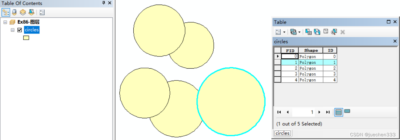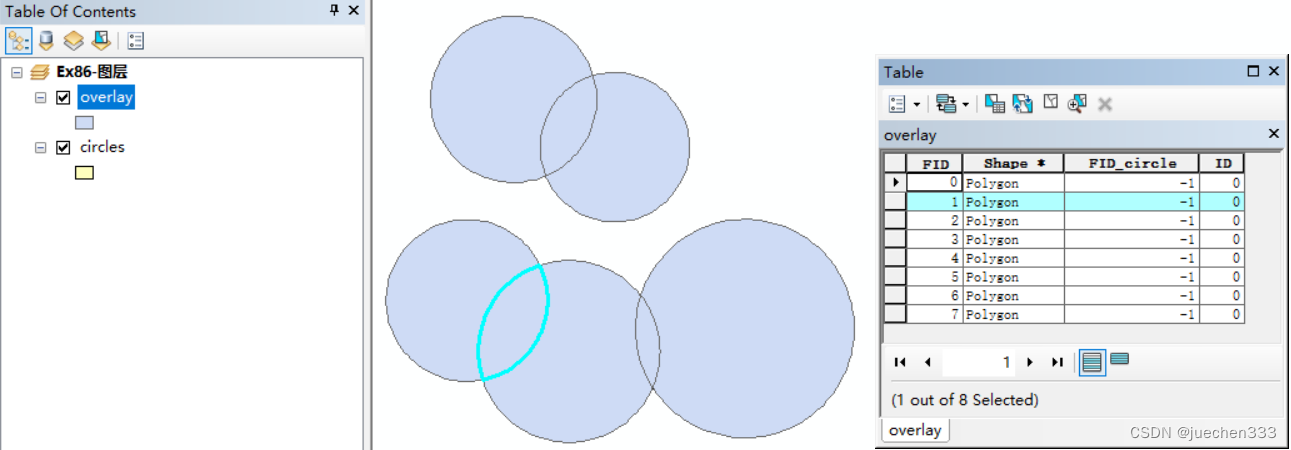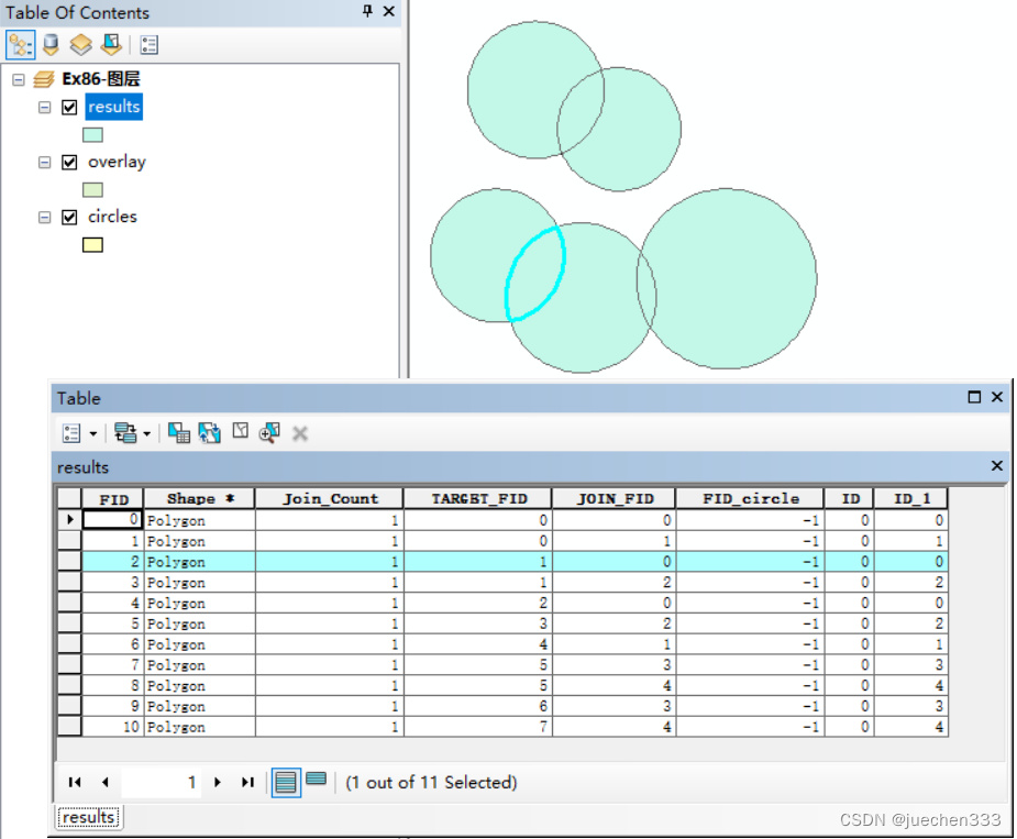 注:对于重叠的区域,其空间位置在原始的圆图形内,因此通过一对多连接操作,原始的圆图形属性会记录到重叠的区域中。