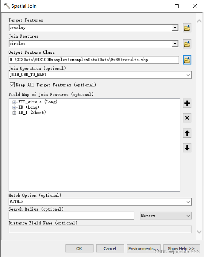 打开【Analysis Tools】→【Overlay】→【Spatial Join】对话框,【Target Features】设置为“overlay”,【Join Features】设置为“circles”,【Output Feature Class】设置为“results”,【Join Operation】设置为“JOIN_ONE_TO_MANY”,【Match Operation】设置为“WITHIN”;点击【OK】,得到具有原始圆属性的重叠图层。