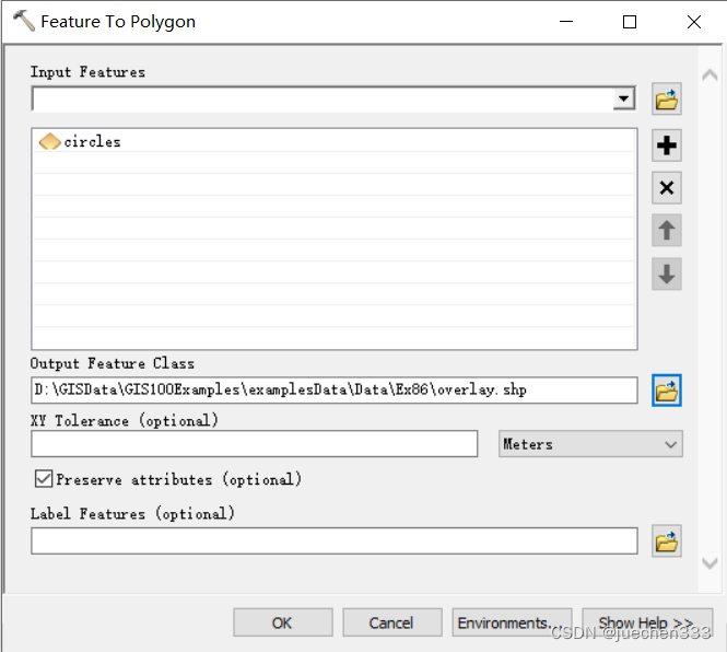 在ArcToolbox中,打开【Data Management Tools】→【Features】→【Feature To Polygon】对话框,【Input Features】设置为“circles”,【Output Feature Class】设置为“overlay”;点击【OK】,得到含有重叠区域的图层数据。