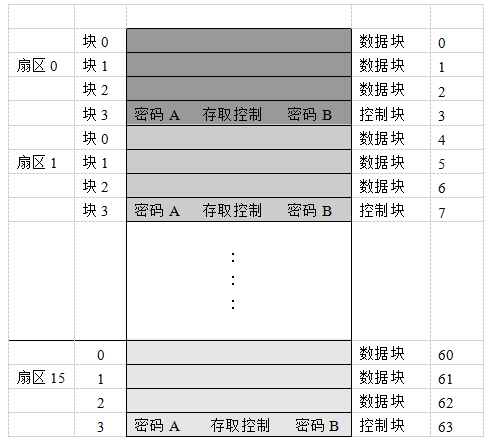 ①分为16个扇区,每个扇区由4块(块0、块1、块2、块3)组成,一般将16个扇区的64个块按绝对地址编号为0~63,相关操作也按绝对地址编号操作