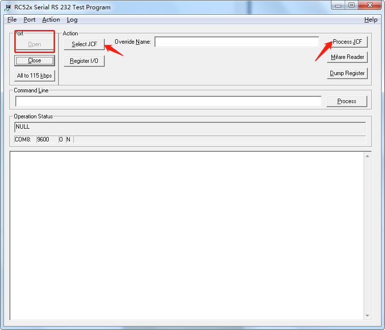 在界面上点击Open,再点击Select JCF,选择文件夹中的mifare_reader_invert.jcf文件,在点击Process JCF
