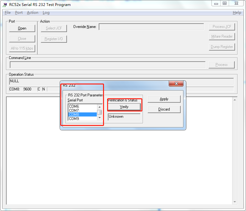 打开Rc52x PcSerial 2.1软件,打开菜单栏的【Port】->【Setting】,选择USB转TTL相应的串口后,点击[Verify],显示OK,然后点击[Apply]。默认波特率9600