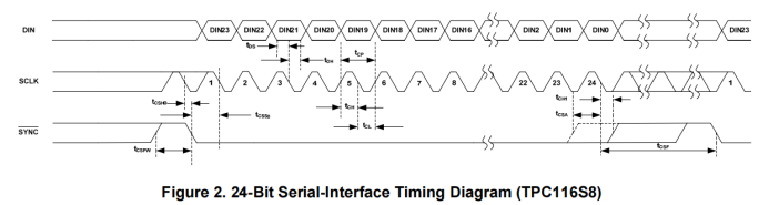 TPC116S8/TPC112S8三线串行接口兼容MICROWIRE、SPI、QSPI和DSP。该接口提供三个输入:SCLK、SYNC和DIN。芯片选择输入(SYNC)线拉低时通过DIN加载串行数据。在芯片选择输入高到低转换之后,数据被同步移动并锁存到串行时钟输入(SCLK)的每个下降沿上的输入寄存器中。每个串行字对于TPC112S8是16位的,对于TPC116S8是24位的。前3位是控制位,接着是1个下电位以及TPC112S8的12个数据位(MSB优先)和TPC116S8的22个数据位(MSB优先),如表1和表2所示。串行输入寄存器在加载16/24位数据后将其内容传输到输入寄存器,并在时钟的16/24位下降沿接收到数据后立即更新DAC输出。为了启动一个新的数据传输,在下一次写操作之前,先驱动SYNC高电平,并保持SYNC高电平至少20ns。同步写脉冲之间的SCLK可以是高的,也可以是低的。图1和图2显示了整个3线串行接口传输的时序图。