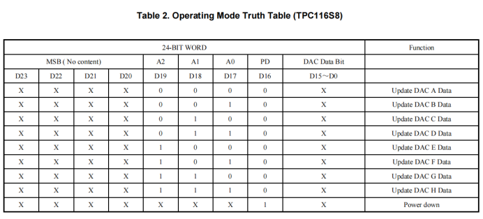 24位数据,D23~20 四位MSB, D19~16通道控制0~7,D15~0 数据值code。VOUT = (code/65,536) x VREF。