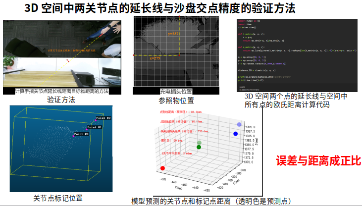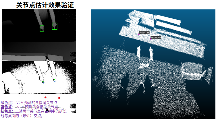 V2V得到手掌16个关节点后,我们使用食指尖和食指末2个关节点的XYZ值,可以计算出其连接线射线与桌面点云的交点位置。