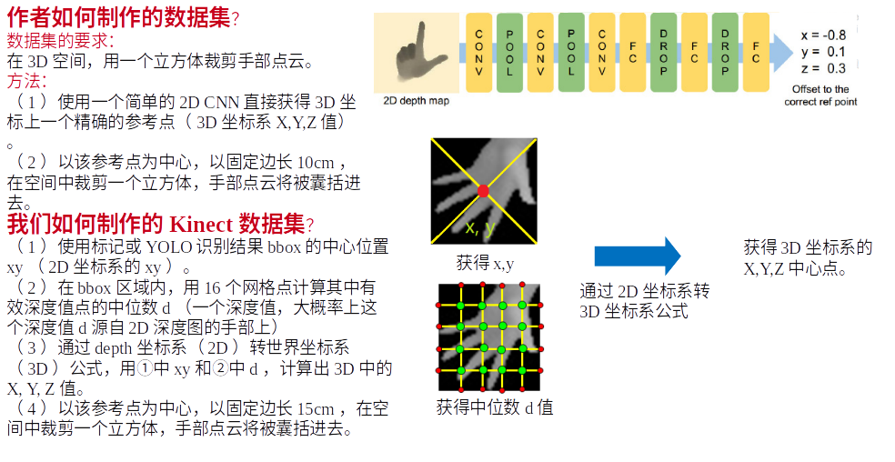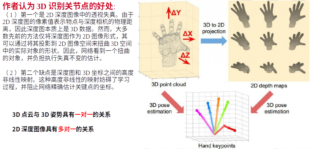 - 第一句话:传统方法是基于2D深度图直接回归关节点坐标,而我们是把2D深度图投影到3D空间,然后用3D卷积去操作,这能解决2D深度图的透视畸变问题。(透视畸变问题见下面)