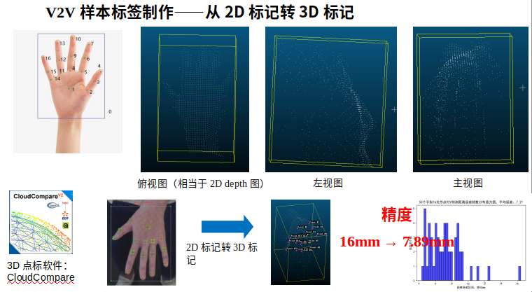 最开始,我们在2D RGB图上标注16个关节点,然后通过RGB图坐标转depth图坐标转3D点云坐标,来获取手掌在3D空间的XYZ标签信息。但是,这种方法导致非常大的标注误差,原因在于,depth图精度并不是特别高,而且有很多噪音。RGB图上标注的点,人眼看上去标的很准,但很可能通过公式,映射到3D空间时,这个点会落在噪音点上。