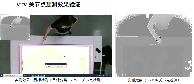 通过手势来虚拟触控激光投影,其中就需要使用V2V算法,识别手掌的16个关节点,并计算手指3关节点的空间延长线和桌面的交汇点坐标。