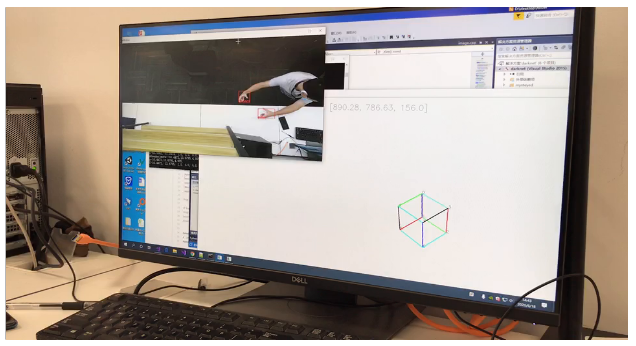 在开发过程中,我们设计了一个3D仿真程序,用于测试各模型及其语义逻辑在虚拟空间的操控效果。初版仿真程序是用一个简单的立方体来表示,后期仿真使用pyqtgraph库设计了一个更全功能的虚拟仿真,包括实时可视化如下内容:环境空间中的所有点云、RGB图、虚拟立方体(用于测试手掌非接触控制它的效果)、手指方向延长线与环境中点云的交汇点等等。