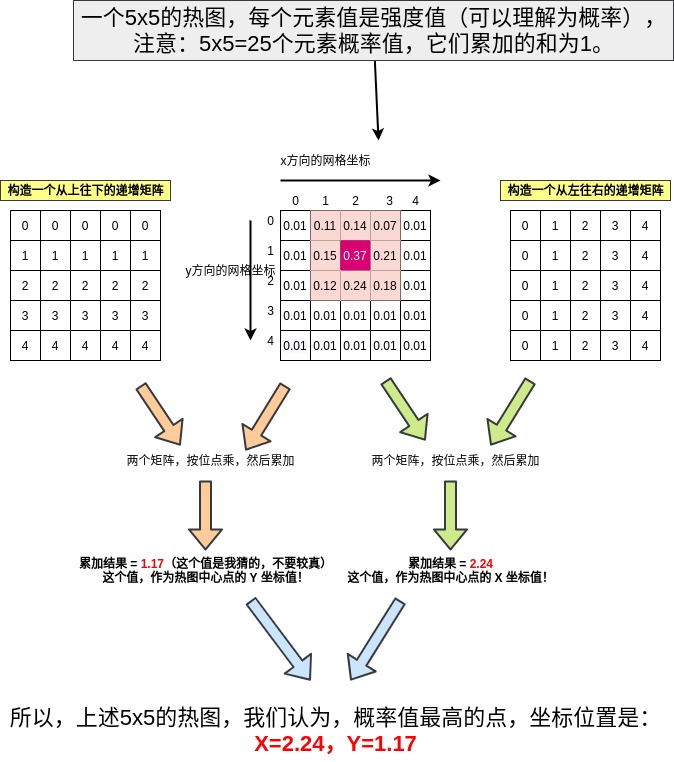 - 上图,关键是理解构造的那两个X、Y方向的递增矩阵就好了,它们和概率图按位点乘然后25个元素累加,其结果的物理意义,就是所有25个点位置的平均值!看热图的X方向,热图中概率最高点0.37,它左边是0.15,右边是0.21,所以,按道理中心点会在0.37网格的右边,而0.37所在的X值为2,所以,中心点的X方向值,应该大于2!实际上按上图这样计算,结果也一定会大于2!