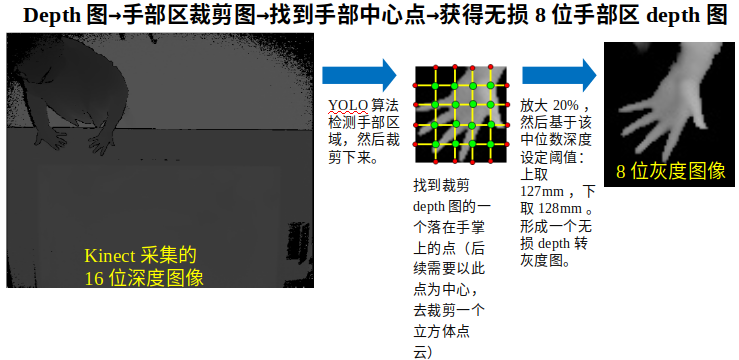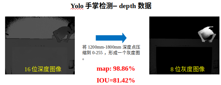 Kinect2相机采集的depth图是16位存储的,原因是depth图中包含距离信息,值在0~2000mm之间。但是实际上我们只需要手部区域的depth图用于后续的V2V做关节点估计。最简单方法是,用YOLO目标检测器训练一个depth图的手掌目标检测模型,让YOLO算法裁剪人的手掌区域。