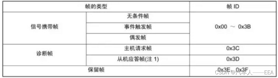 LIN总线根据帧ID号的不同,把报文分为信号携带帧、诊断帧、保留帧 (帧ID的取值范围为0x00~0x3f总共64个)