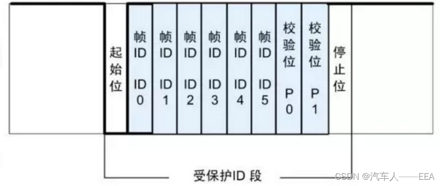 PID段(受保护ID)段(受保护的ID的前6位叫做帧的ID,加上两个奇偶效验码后称作受保护的ID)。