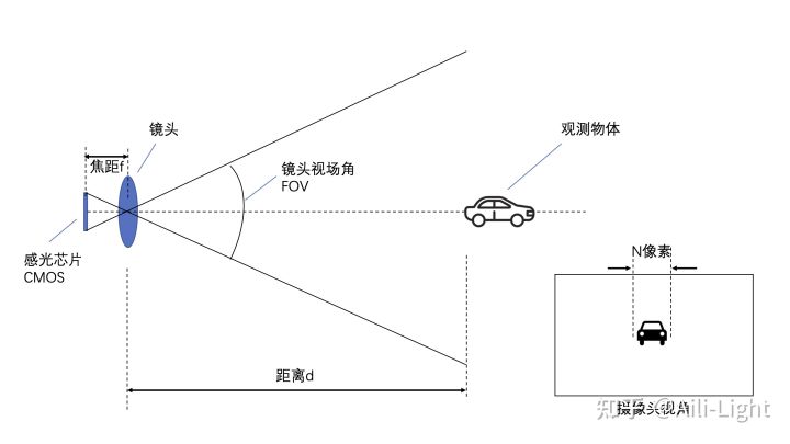 镜头的视场角决定了每个像素能感知到的物体大小,例如2百万像素、靶面尺寸为1/2.6’’、FOV60°的摄像头,在110m远处,每个像素对应的大小约是6.5cm 。如果一辆小汽车的尺寸是1.6m×1.6m,它在图像中就会占据24×24个像素。一般情况下,假设镜头符合小孔成像模型,可以近似地认为像素数量M和物体尺寸h的关系为: