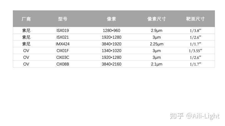 表2:常见的车规感光芯片的像素和靶面尺寸(单位为英寸)