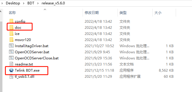 下载解压后如下图,Telink BDT.exe带UI烧录程序,configCmd_download_tool.exe为命令行,doc目录下是文档