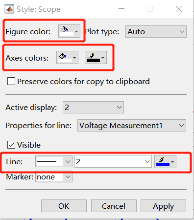 第一步:设置示波器,默认示波器以及设置后的示波器如图 1所示。单一波形显示为黄色,背景为黑色。首先调整示波器的显示界面。View->Style,其中Figure Color设置为 白 ,Axes Color 背景设置为 白 ,字设置为 黑,波形设置按照个人喜好设置,本人一般设置粗细为 2 ,颜色为 红 黑 蓝,如图 2所示。