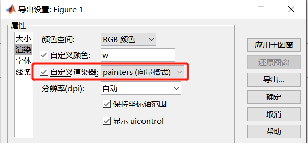 第三步:导出Figure。这是本文总结的关键之一。Figure窗口:文件->导出设置->属性:大小(这里可以根据论文需要设置宽度和高度,不设置可以忽略)->属性:渲染 自定义渲染器 向量格式 勾选(一定要勾选,默认不勾选)->应用于图窗(可以预览效果)->导出 保存类型下拉选择Enhanced metafile即emf文件(默认是MATLAB Figure)。