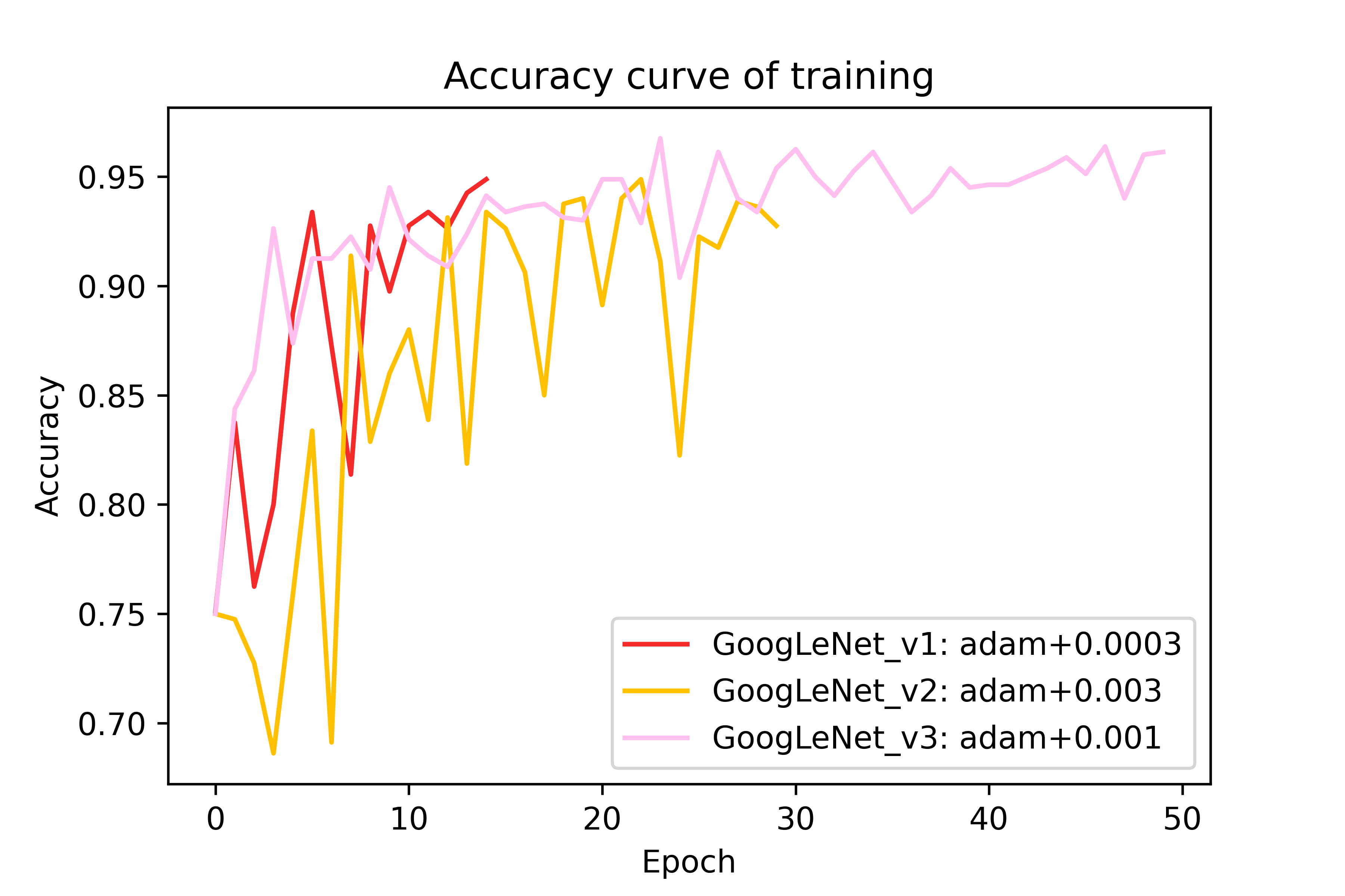 通过对比三个参数版本的GoogLeNet网络,分别计算其验证集上的网络分类性能指标——accuracy、precision、recall、F1,我们发现:使用Adam优化器在学习率为0.001条件下训练的GoogLeNet_v3网络的泛化能力最强,准确率最高。