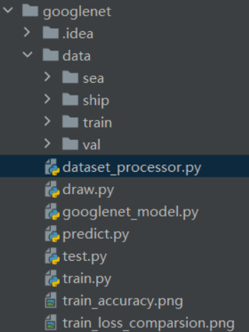 data文件夹:sea和ship文件夹用于存储原始数据,以及存储划分好的训练集(train文件夹)/测试集(val文件夹)数据;data_processor.py:对原始数据进行训练集/测试集划分;googlenet_model.py:定义了GoogleNet网络具体结构的代码;train.py:用于训练网络的代码,计算loss和accuracy,保存训练好的网络参数;test.py:用于测试网络性能、计算模型分类指标;predict.py:用自己的数据集进行分类测试draw.py:用于绘制损失函数曲线和准确度曲线;`