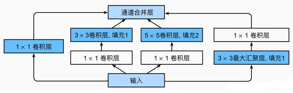 由四条并行路径组成的Inception块,可以融合不同尺度的特征信息——前三条路径使用窗口大小为1×1、3×3和5×5的卷积层,从不同空间大小中提取信息。中间的两条路径在输入上执行1×1卷积,以减少通道数、减少模型训练参数,从而降低模型的复杂性。第四条路径使用3×3最大池化层,然后使用1×1卷积层来改变通道数。这四条路径都使用合适的填充来使输入与输出的高和宽一致,以保证输出特征能在通道 channel 维度上进行拼接。最后将每条线路的输出在通道维度上连结,并构成Inception块的输出。Inception块的通道数分配之比,是在 ImageNet 数据集上通过大量的实验得来的。