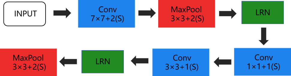 低层的特征提取需要分别经过3个基础卷积结构,2个最大池化层,2个LPN结构。其中LPN为局部响应归一化操作,增强了模型的泛化能力,在这里不做分析。低层结构: