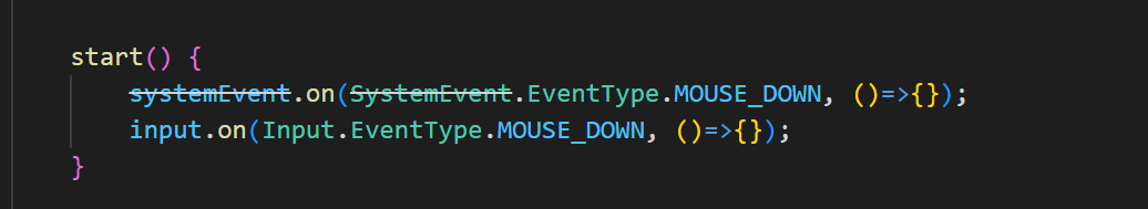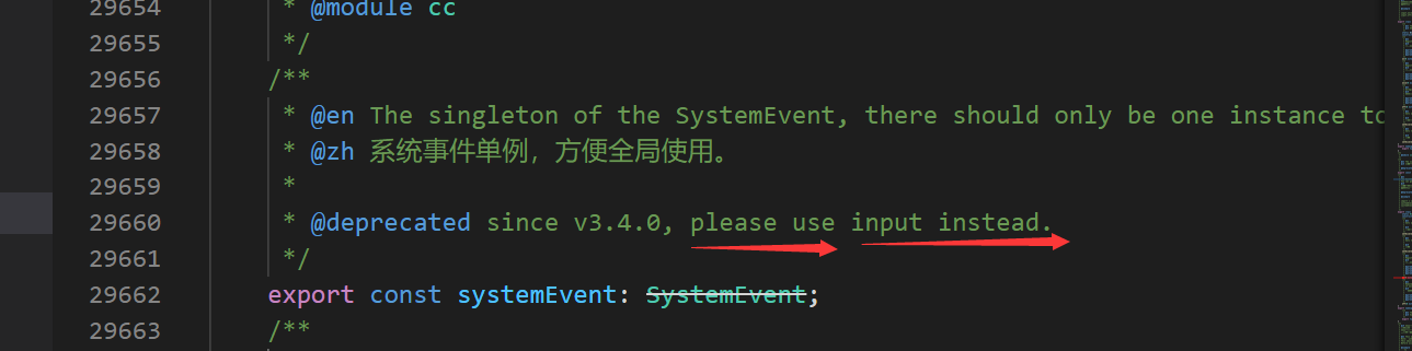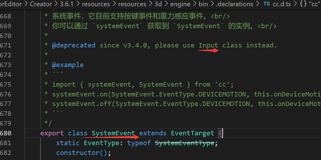 再来看一个接口变化的例子,当我们用systemEvent的时候在新版本的Cocos Crator里面会有如下的提示,表示接口已经移除了不能用了: