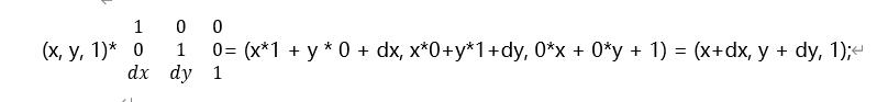 先来看平移矩阵,我们以2D为例, 向量(x, y)平移变换到新的空间,平移就是把x, y都加上一个常量。那么平移变换矩阵为