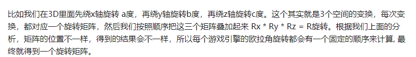 平移缩放,大家都好理解了,旋转矩阵不那么直观,特别是3D的。我们以大家熟悉的欧拉旋转为例。