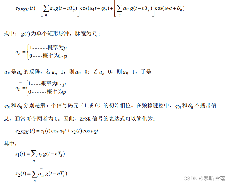由图我们可以看出,一个 2FSK 信号可以看成是两个不同载频的 2ASK 信号的叠加。因 此 2FSK 的时域表达式又可以写成 :
