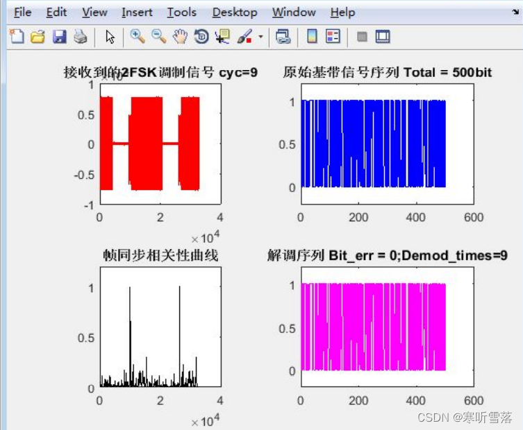其中,cyc 显示接收数据次数,下方画出了帧同步曲线,原始基带信号和长度也示于上面, 解调序列显示误码率和解调次数,可以看到 bit_err 为 0,解调完全正确。 下图为2FSK调制解调图: