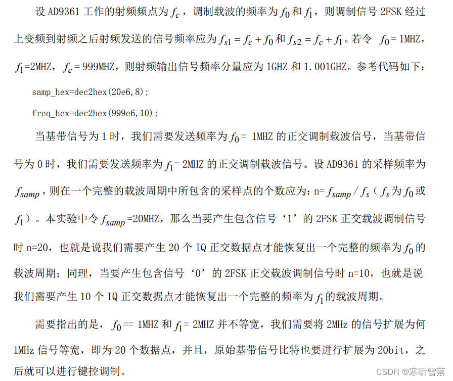 对于接收端,我们需要接收发送端的 2FSK 调制信号,因此 AD9361 的采样率和频点必 须与发送端一致,即samp_hex=dec2hex(20e6,8); freq_hex=dec2hex(999e6,10);