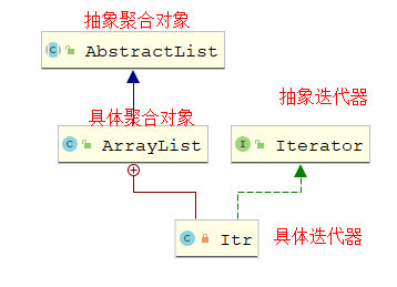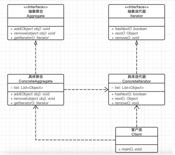 Aggregate:抽象聚合对象,保存数据的集合对象。迭代器遍历元素的提供者,可以是抽象类有可以是接口。比如:List 接口 或者 AbstractList抽象类。