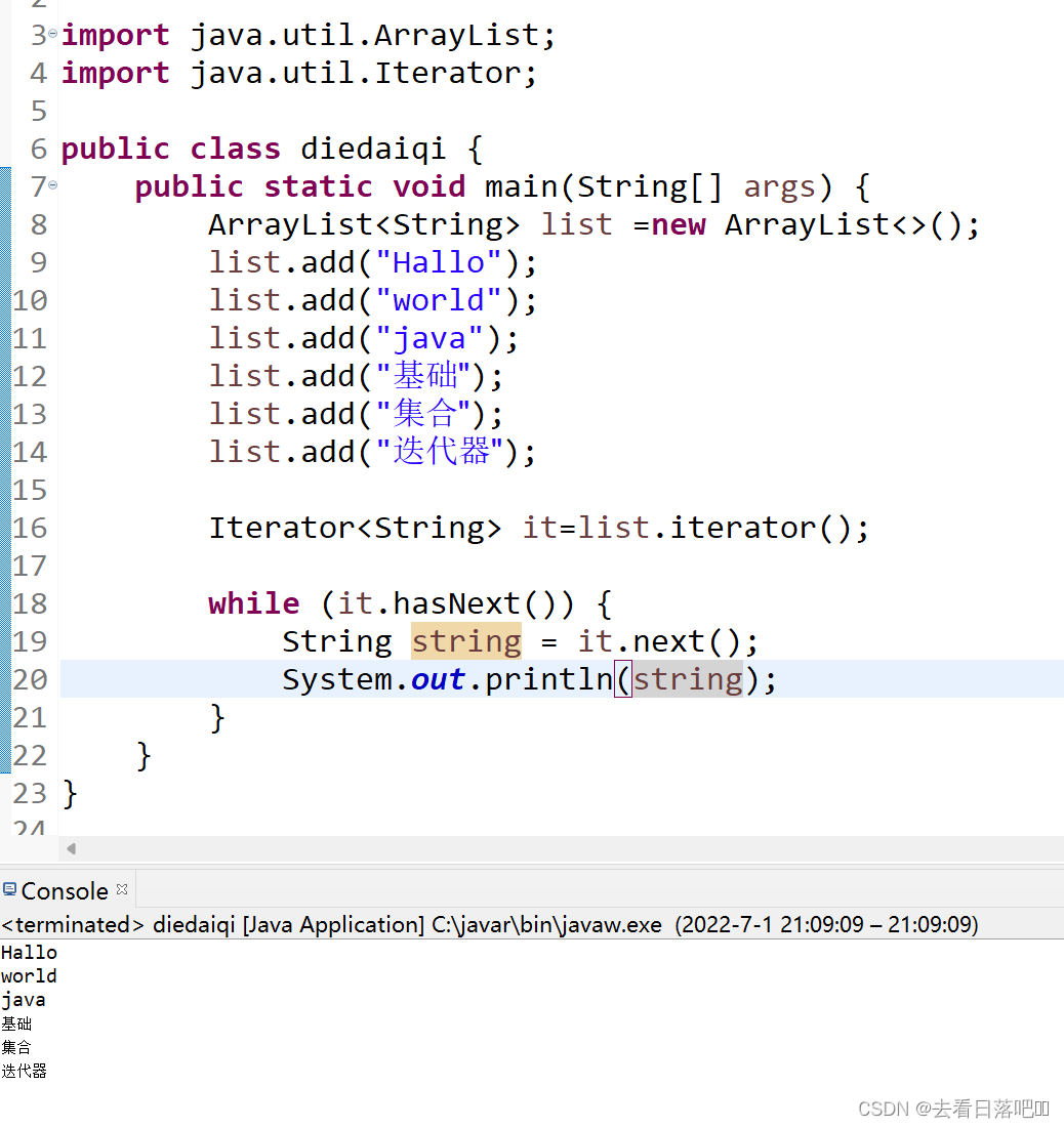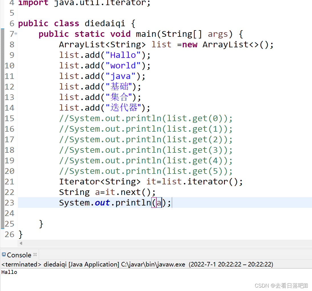 Iterator迭代器里有.next方法可以直接去集合元素,然后把这个元素交给一个变量,输出会得到这个元素。