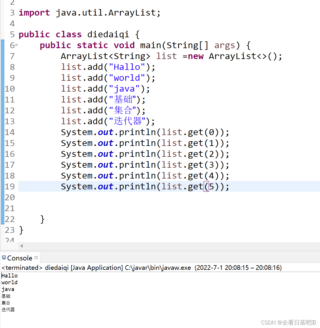 在ArrayList中如果想要遍历集合获取对应索引值位置参数的话,如下图使用集合的get方法逐一获取太古老,如果集合列表太大的话这种方法不建议使用,所以我们可以用Iterator迭代器来遍历集合。
