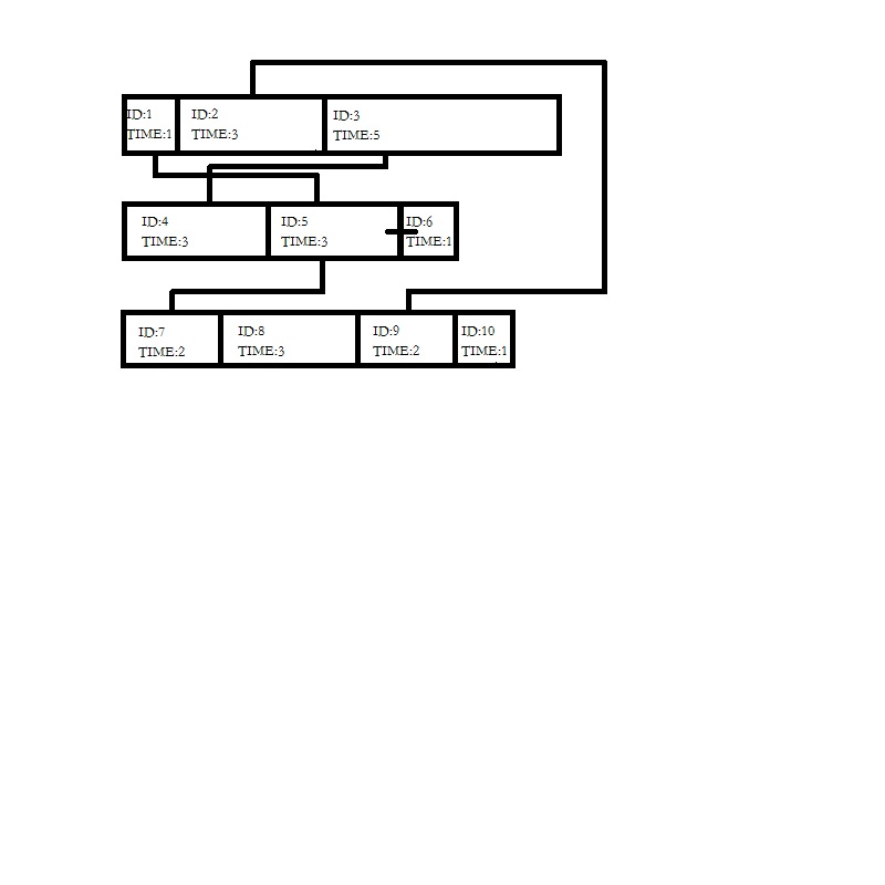 工厂生产的产品是由一步步零件不断加工和装配完成的。产品的加工需按照严格的工序进行,即只有一个零件所需的全部组件的上一步工序完成,才能进行下一步工序,且保证上一步的组件只会被下一步中一个零件引用,每台机器同时开始加工,流水线严格按照时序进行,不存在等待情况。