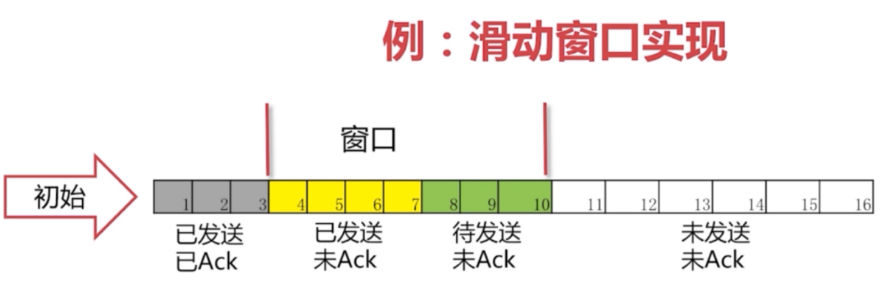 在这张图里我们可以看到,灰色1,2,3号包已经发送完毕,并且已经收到了ACK,4,5,6,7号包是黄色的,表示已经发送的,没收到ACK的意思就是也不知道对方接收到了没有,但还没有收到ACK,8,9,10号包是绿色的,表示还未发送,白色部分表示还未读入内存,要等到4-10号包收到ACK后才会有所动作。