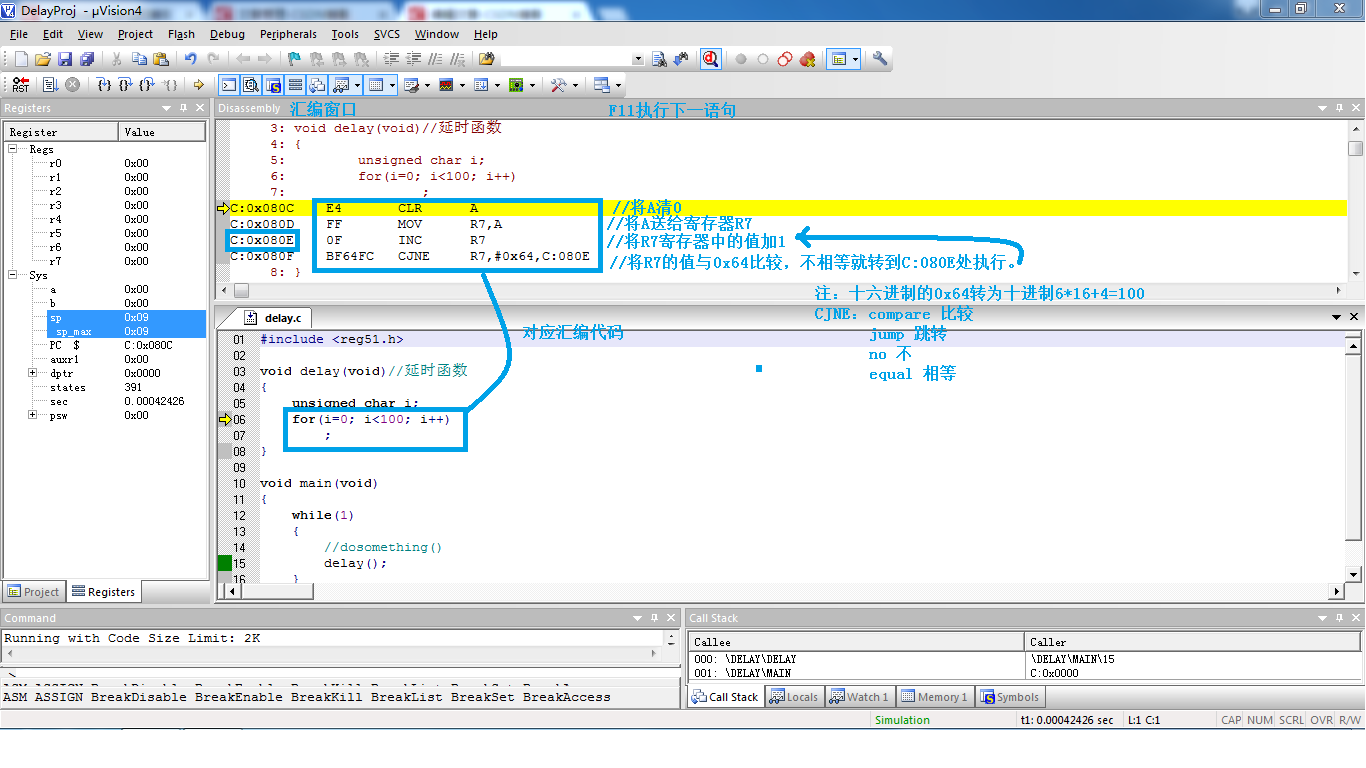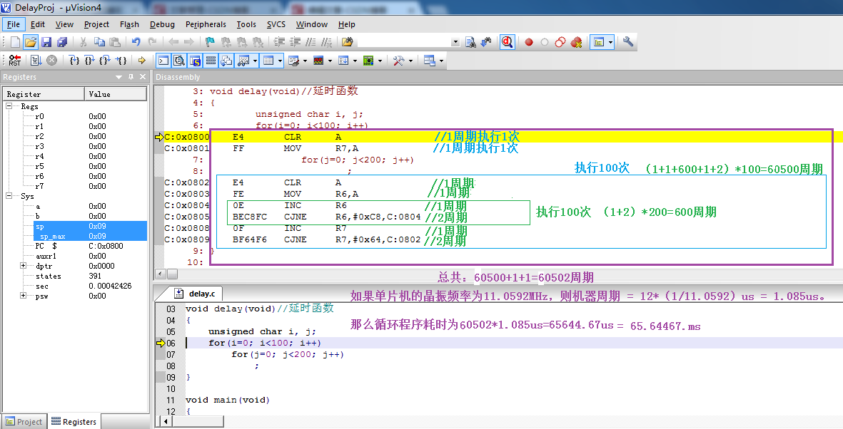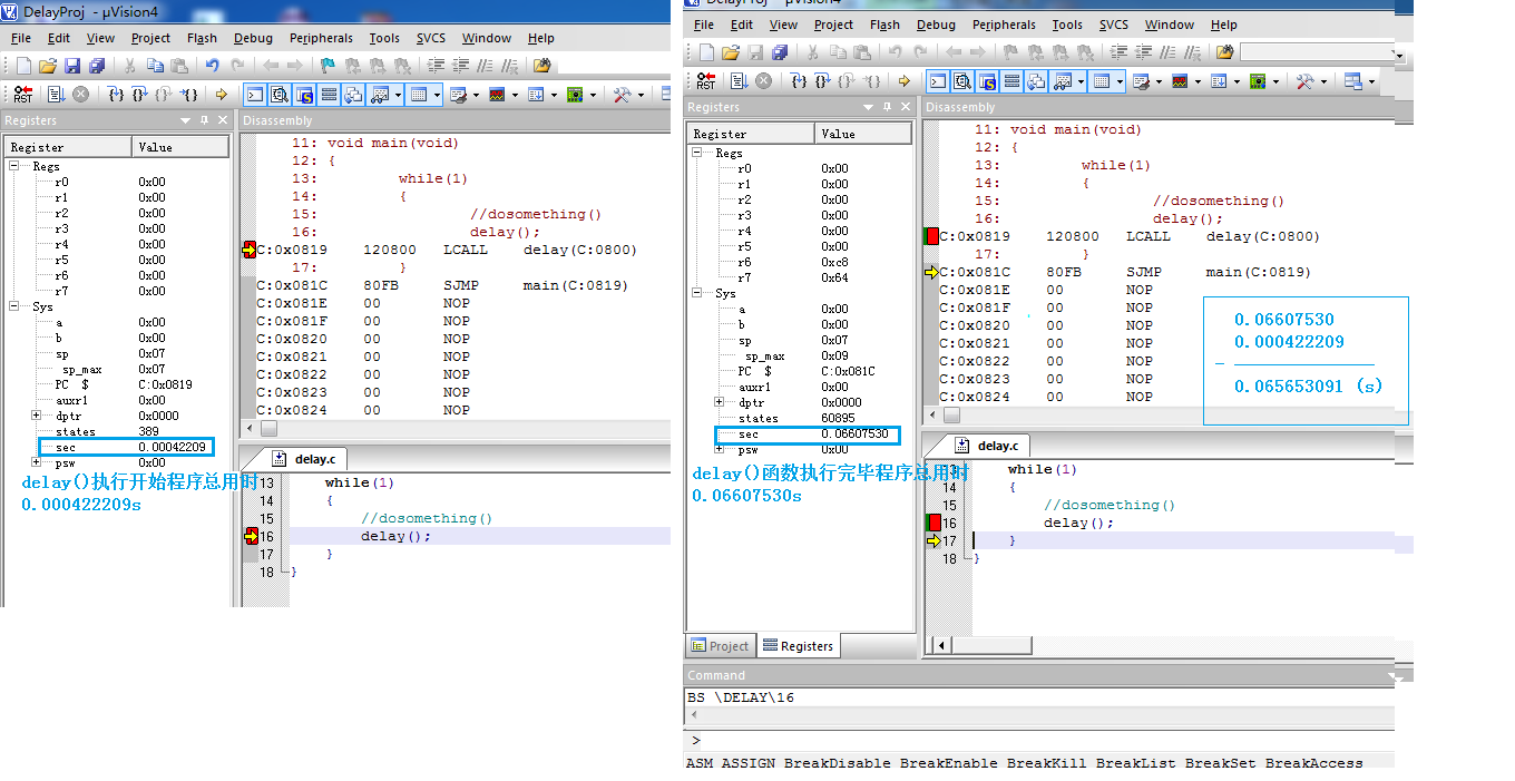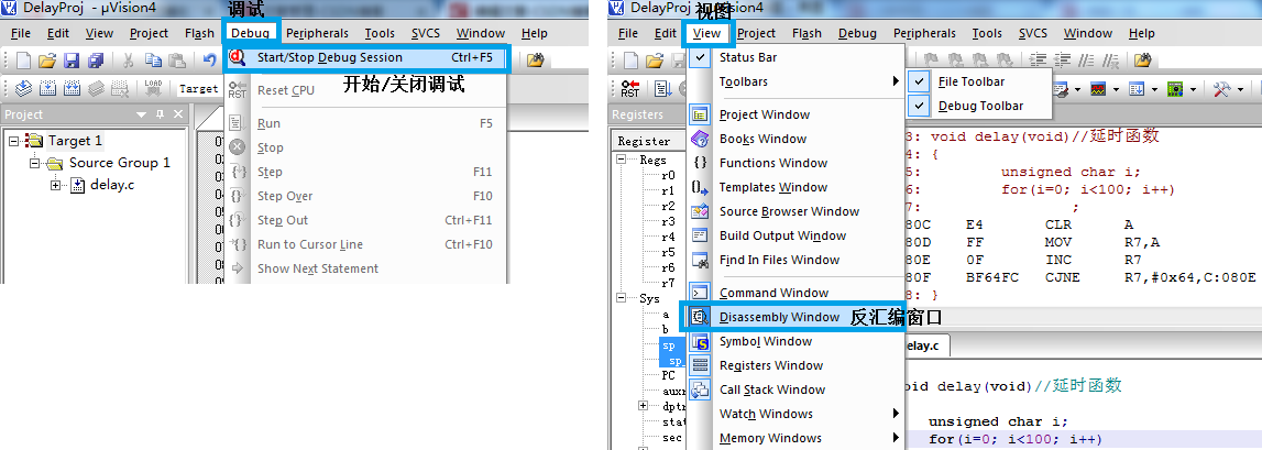 在Keil C51 环境下编译后,点击"调试"--"开始";在执行"视图"--"反汇编",可以看到延时函数对应的汇编代码。