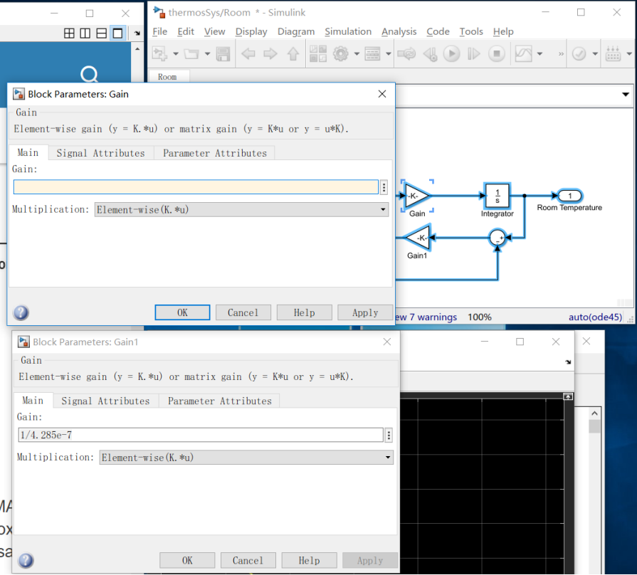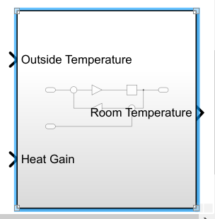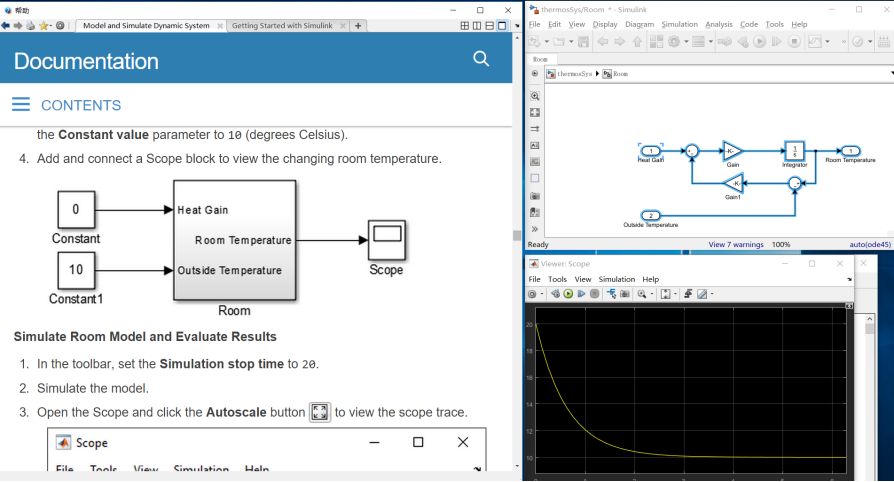大致的意识就是这个屋子,外界给热量,外界也有温度,里面是一个反馈系统,屋子的温度比外界温度高,那就丧失热量,如果丧失的热量比外界给的多,那么整体热量就会下降,积分器代表的是当前温度,我们设置其为20℃,整体热量的变化除以比热容就是温度的增减,所以当我们设置外界不给屋子热量(Heat Gain = 0),外界温度是10(Outside Temperature = 10)室内初始温度是20(积分器初始值设置为20)以后,屋子的温度就会因为外界低温而下降,开始温差大,降温快,后面温差小,降温慢。