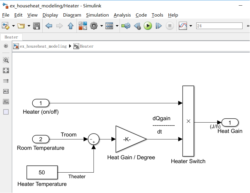 意思就是加热器50℃,读取室温,做差,经过一个放大器也就是一个热量/温度的定值乘法器,这个就是描述这个加热器的性能的了,比如温差是1℃,能向室内散发多少热量,它来衡量,之后经过一个开关,得到的就是释放到室内的热量(焦耳)。